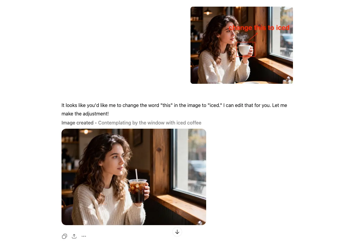 Changed your mind? No problem. Just draw a box right on the photo and tell GPT 1.5 exactly what you want—like turning that steaming latte into a refreshing iced coffee. It's like talking to a magic editor. The AI reads your scribbles, swaps the object instantly, and keeps the lighting and fingers looking 100% real. No complex tools, just point, type, and voila.